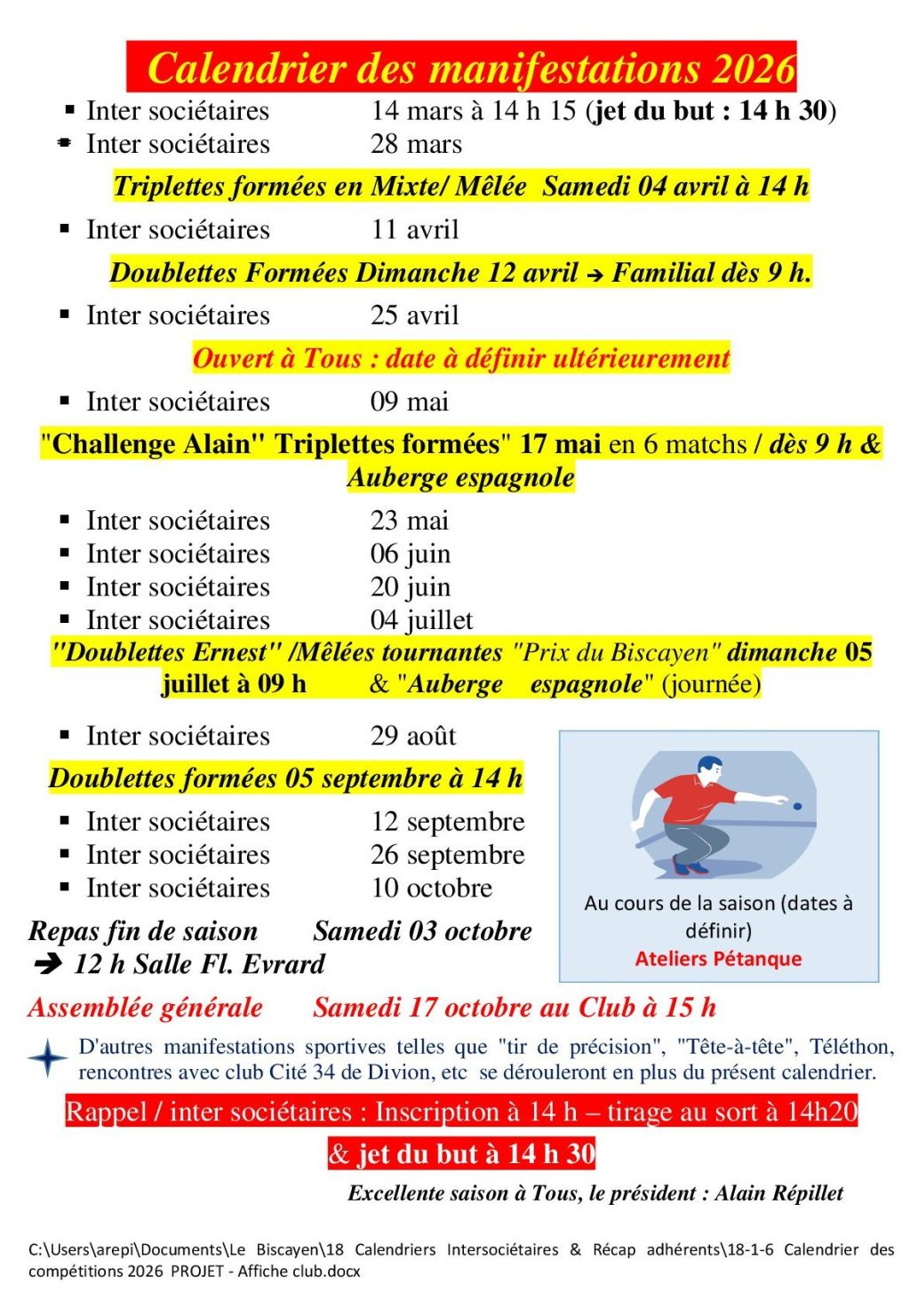Vous trouverez ci-dessus notre calendrier reprenant une grande partie des manifestations organisées par notre club pour l’année 2025. Certaines choses changent telles que : ※ Pour les Intersociétaires : il n’y plus de mise à donner, ce qui favorise en particulier les Jeunes joueurs ne disposant pas d’argent ※ Nous passons de 11 à 13…